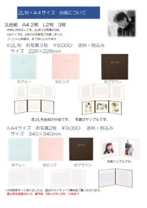 シルバーと木目があり、壁掛けと直置きの2つが出来ます。゜台紙 2L判 三つ折りタイプ ¥6,000-